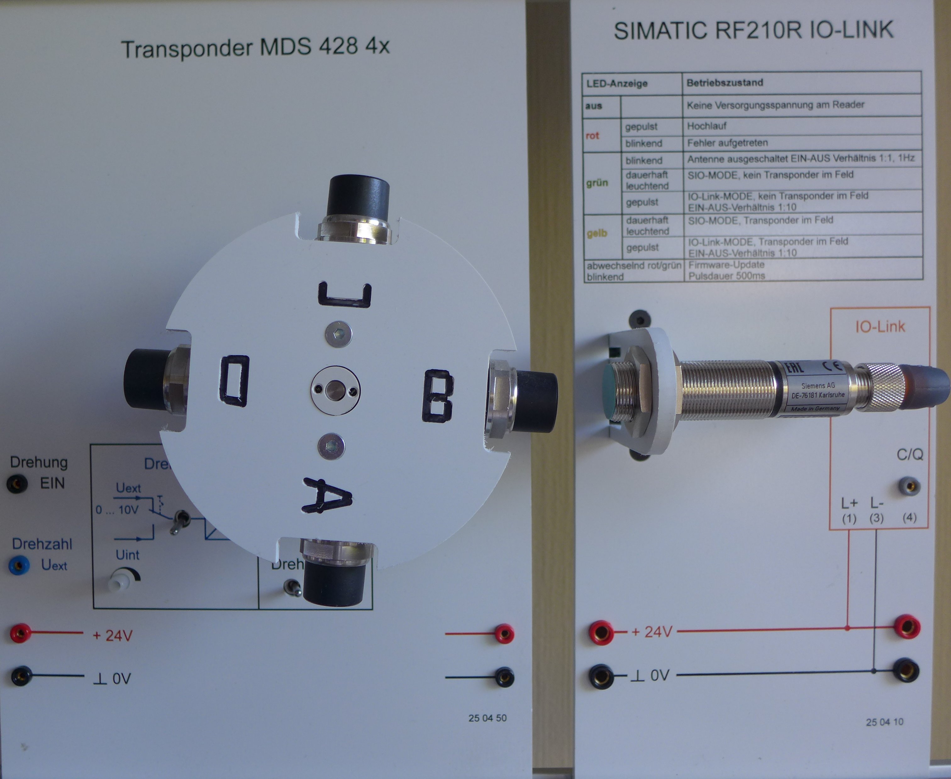 Reader RF210-IO-LINK u. Transponder MDS 428 Best. Nr.: 25 04 10 Best. Nr.: 25 04 50 Der SIMATIC RFID Reader RF200 IO-Link (6GT2821-1AC32) ist in unser DINA4 Plattensystem eingebaut. Der Abstand zur Platte ist frei wählbar. Alle erforderlichen Anschlüsse sind auf die Platte herausgeführt. 4 SIMATIC RFID Transponder MDS-428 sind in unser in DINA4 Plattensystem eingebaut. Die 4 Transponder befinden sich auf einer drehzahlsteuerbarer Scheibe. Ein-und Ausschaltung der Drehung entweder über einen Schalter oder ein 24V Spannungssignal. Veränderung der Drehzahl mit einem Poti oder einer analogen Eingangsspannung. Alle erforderlichen Anschlüsse sind auf die Platte herausgeführt |